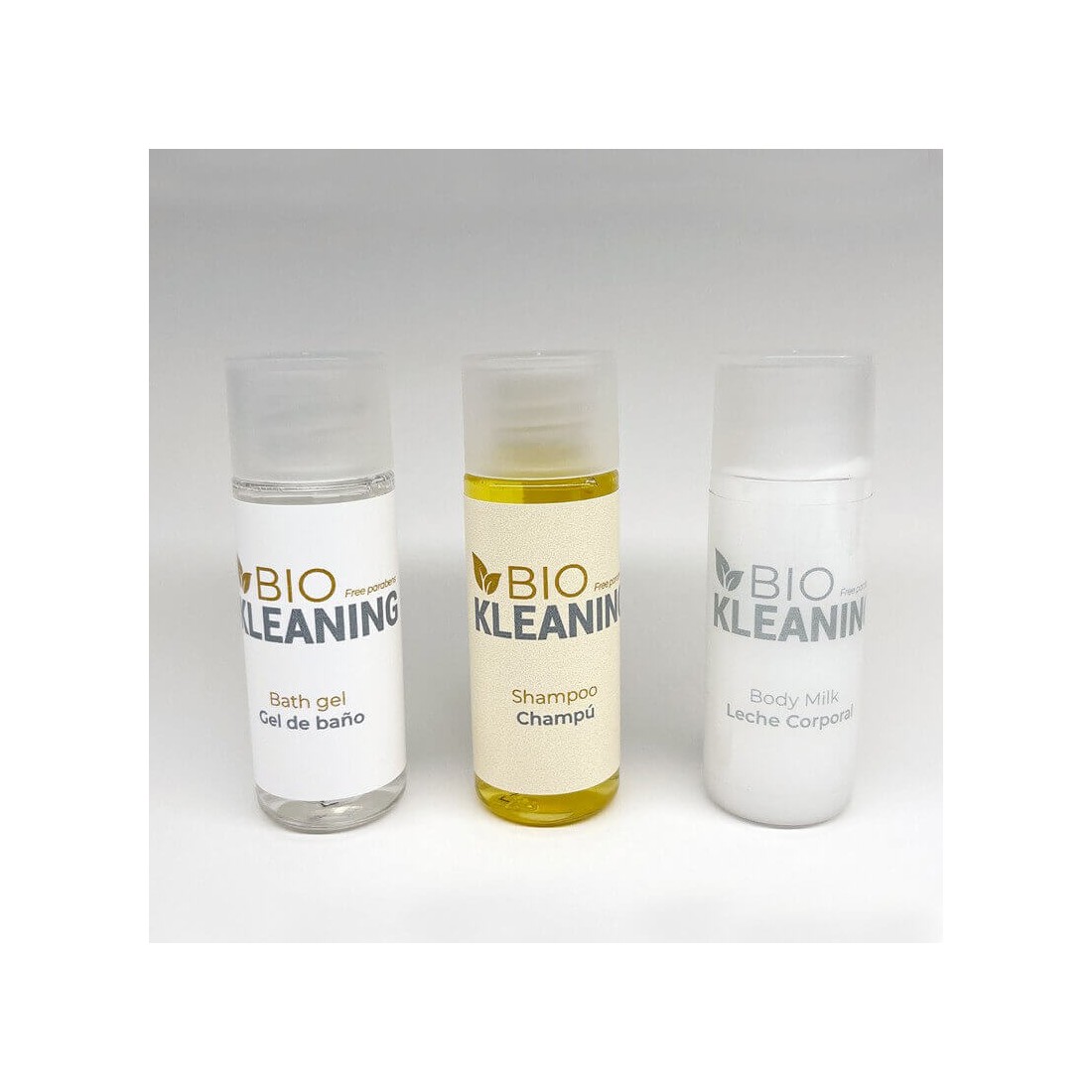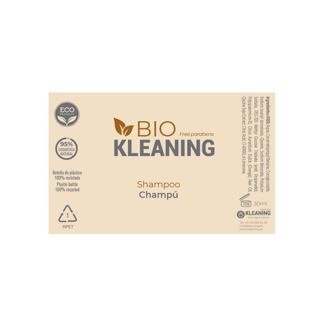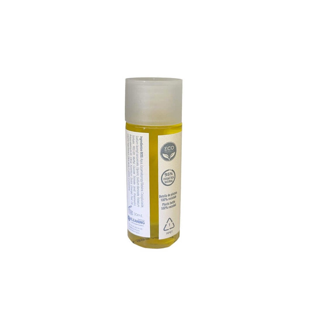 Lo shampoo hotel biologico è confezionato in un flacone trasparente dai toni vivaci. Si tratta di un flacone da 30 ml che è stato prodotto in modo sostenibile, poiché la sua composizione in plastica è riciclata al 100% e, inoltre, questo materiale può essere riciclato nuovamente. In questo modo, Kleaning contribuisce alla lotta contro l'inquinamento e il cambiamento climatico.