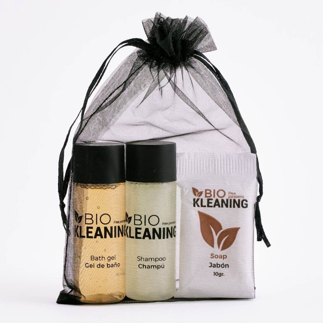 Kit di prodotti ecologici per hotel, composto da un gel doccia ecologico, uno shampoo naturale e una saponetta biodegradabile. Confezione da 100 unità presentate in sacchetti di organza.